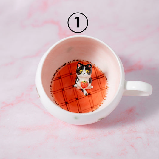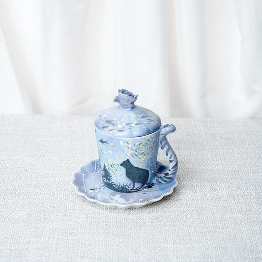 Night Sky Cat Ceramic Set, HandPainted Mug and Saucer, Tail Handle and Rose Lid Design Pottery Mug, Cat Lovers Gifts, Valentine's Gifts