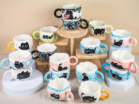 Kawaii Black Cat Coffee Mugs Handcrafted Paw Print Shaped Espresso Cups Cartoon Style Rainbow Colors Cute Cat Water Cups Birthday Gift Ideas