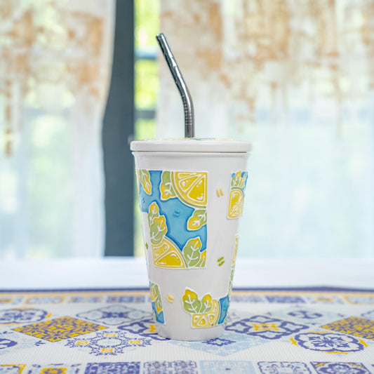 Summer Cat Lidded Tumbler with Straw Swimming Black Kitty Ceramic Coffee Mug Lemon Leaves Handmade Water Cup Cute Birthday Gift for Kids